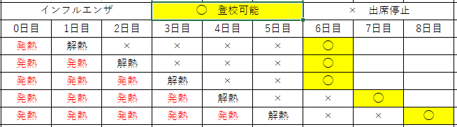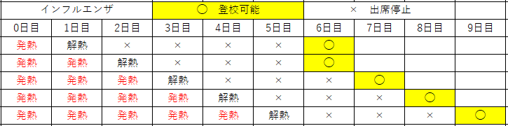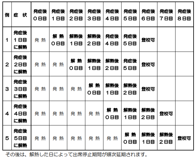 インフルエンザの出席停止期間の基準は、「“発症した後5日を経過”し、かつ“解熱した後2日(幼児にあっては3日)を経過”するまで」であるため、この両方の条件を満たす必要があります。